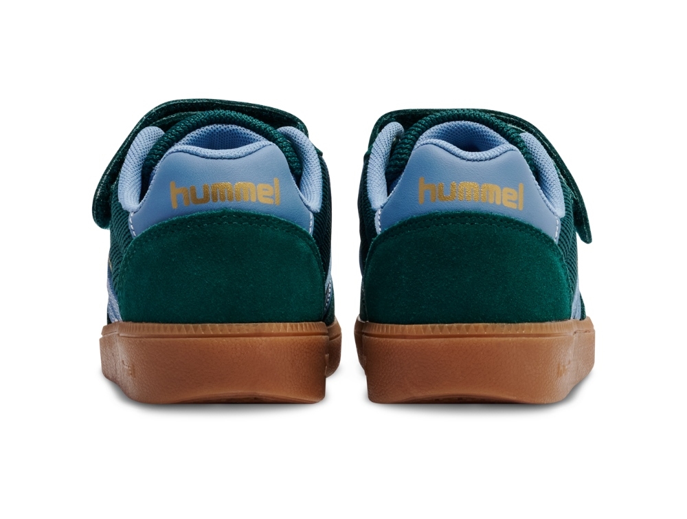 Skoen er designet med elastiske snørebånd og velcrorem over vristen, så den er nem for børn at tage af og på selv. Den flade gummisål giver stabil kontakt med underlaget og et retroinspireret udtryk, der kendetegner hummels klassiske sneakers.