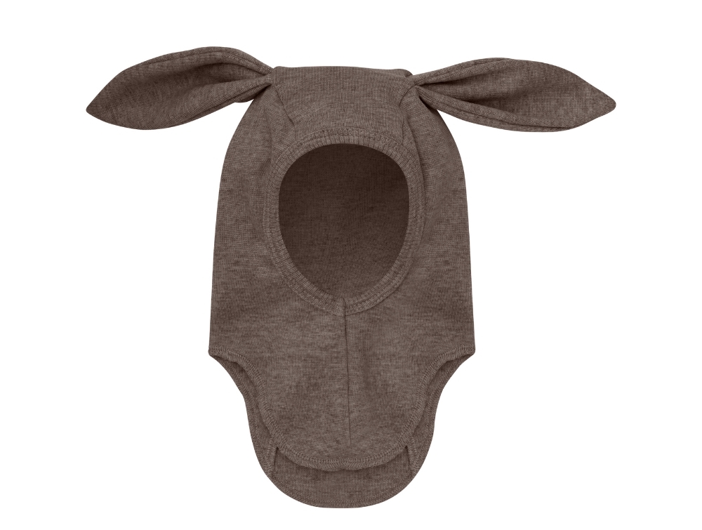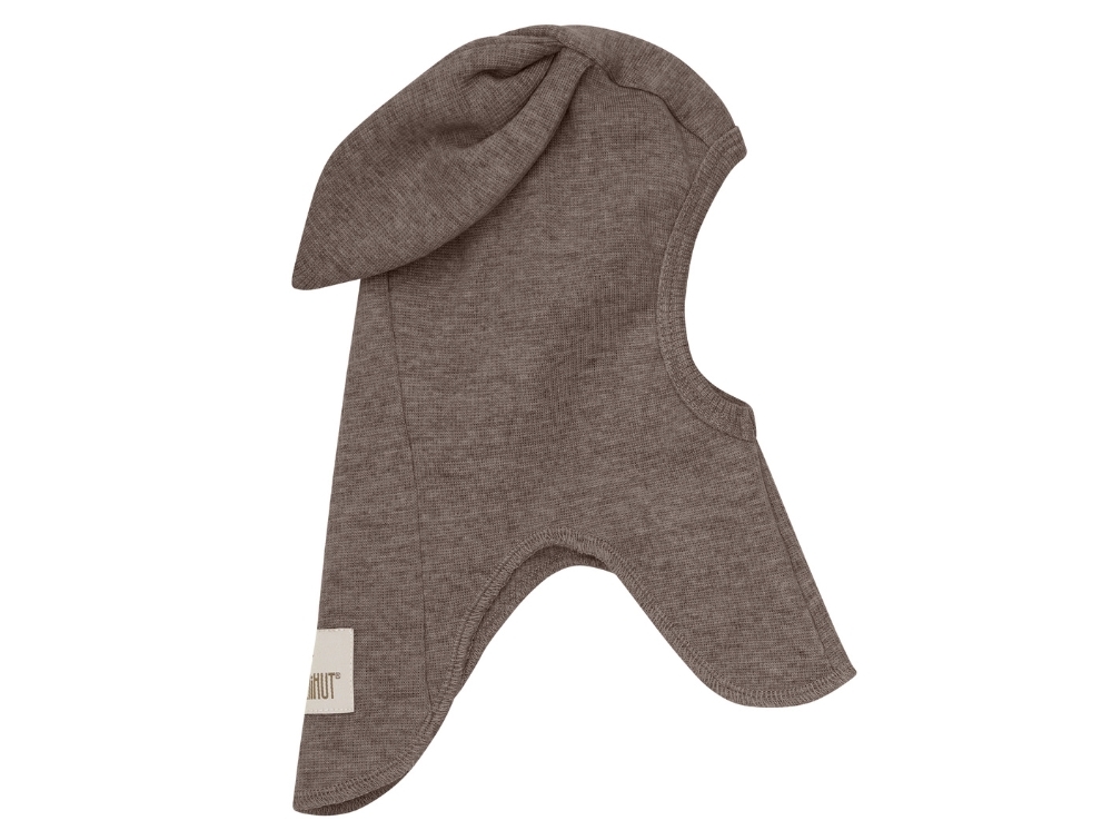 Huttelihut balaclava brown melange med lange ører brugt af babyHuttelihut balaclava brown melange med lange ører set forfraHuttelihut balaclava brown melange med logomærke og ørerHuttelihut balaclava brown melange med lange ører set fra siden