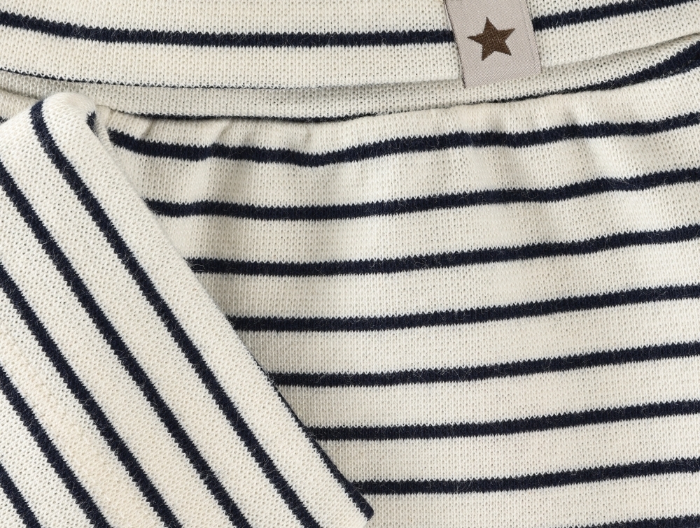 Bukser i råhvid nuance med mørkeblå striber (navy blazer) fra Huttelihut i blød ribkvalitet.