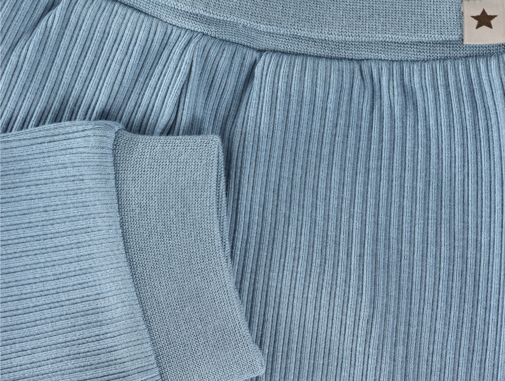 Bløde bukser i støvet blå nuance (windward blue) fra Huttelihut i ribkvalitet med ekstra bred ribkant i taljen, som sikrer en behagelig pasform.