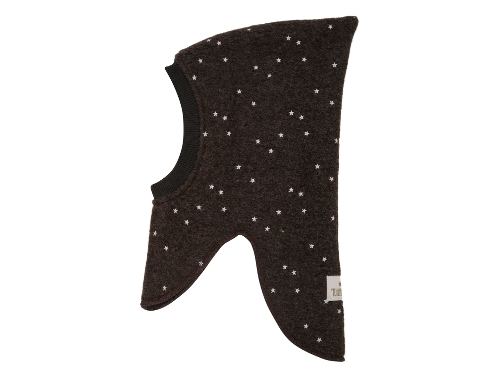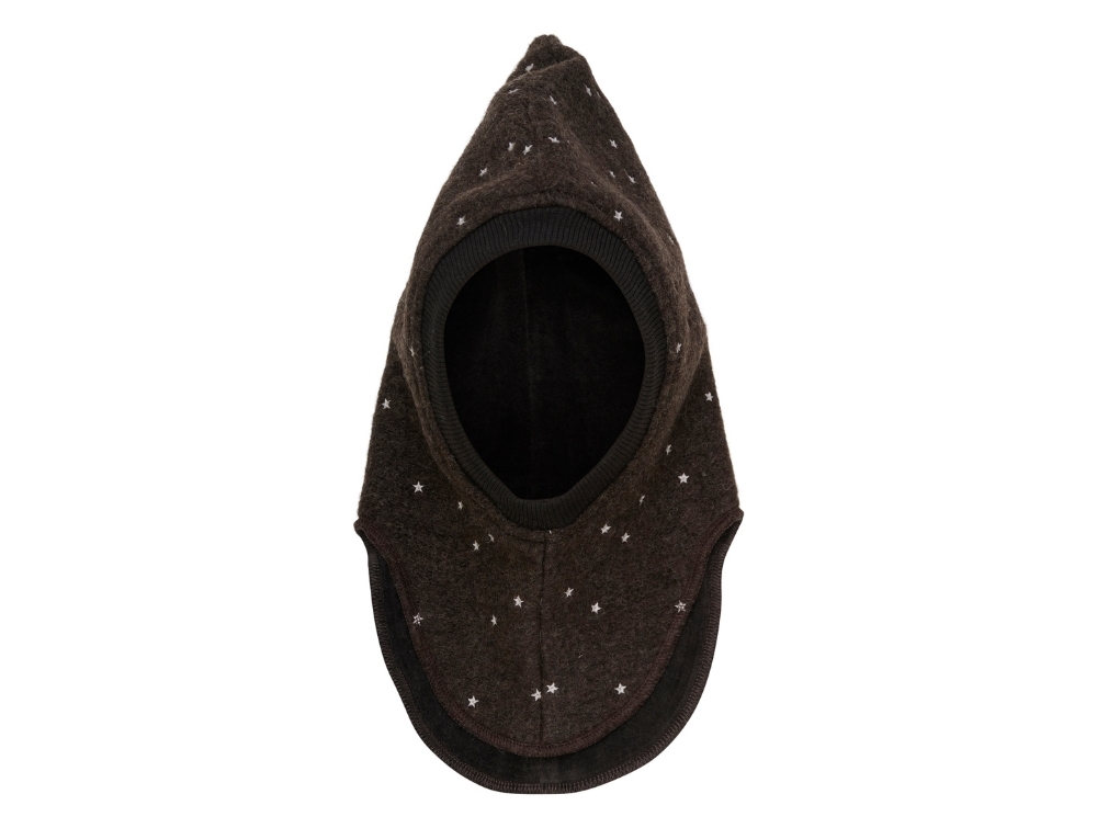 Elefanthue i mørkebrun nuance fra Huttelihut med broderede stjerner. Huen er lavet i en blanding af 80% uld og 20% polyester med blødt foer i bomuldsblanding.