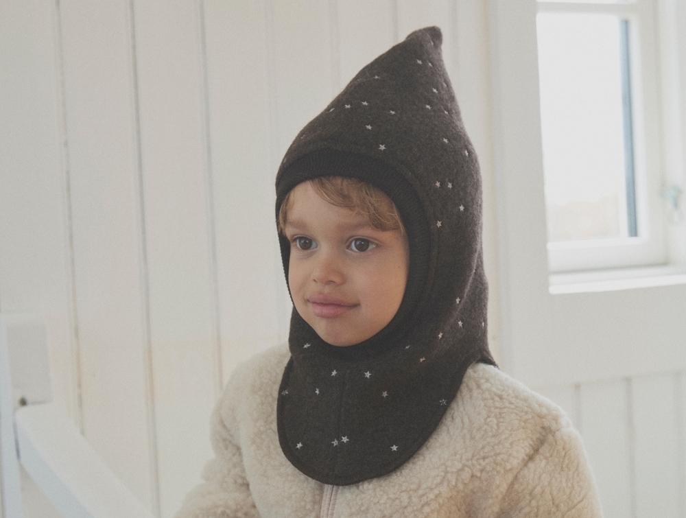 Elefanthuen har en spids form og sidder tæt om hovedet, ører og hals. Den fine mørkebrune nuance kombineret med broderede stjerner skaber et sødt look. Huen har et blødt bomuldsfoer, som føles behageligt mod barnets hud og gør elefanthuen behagelig at have på.