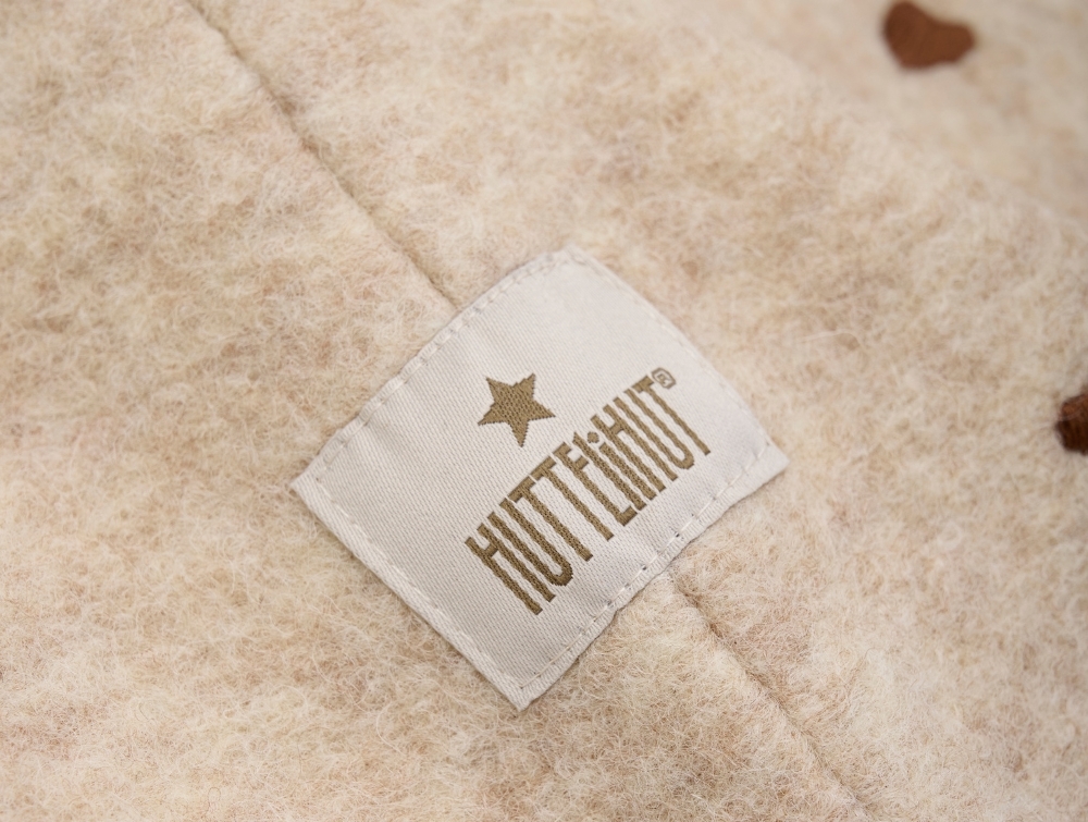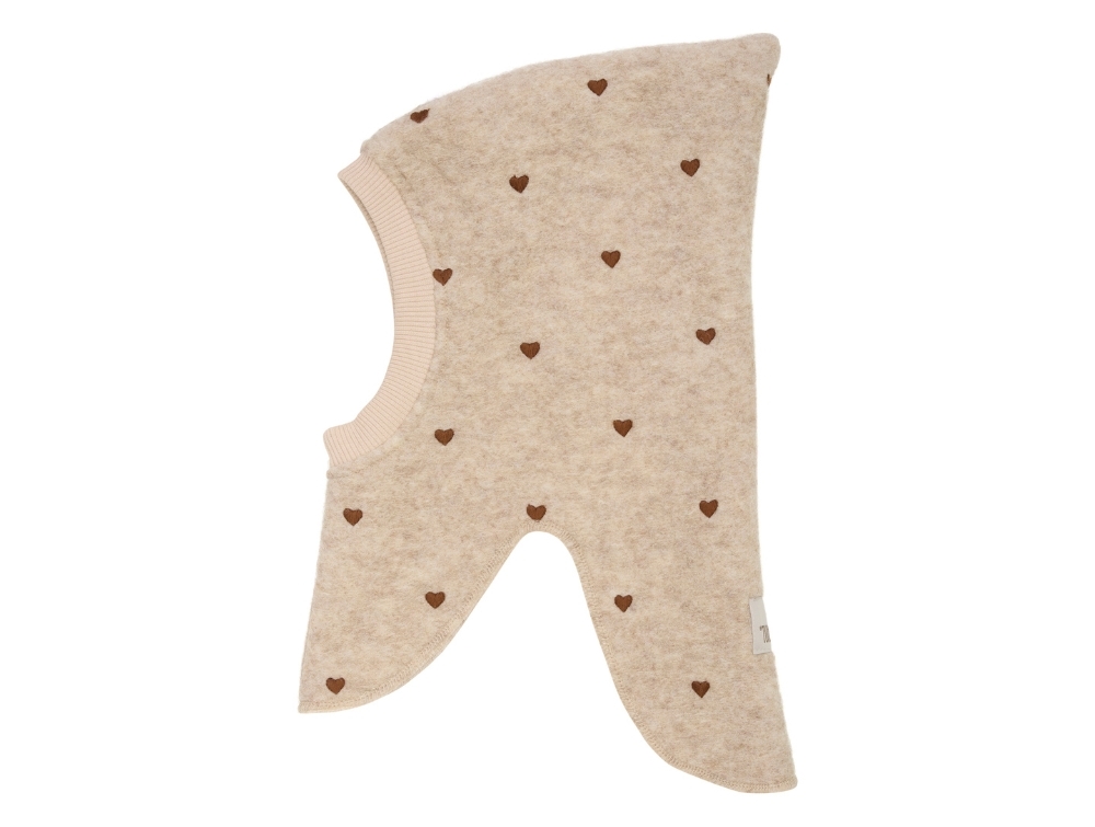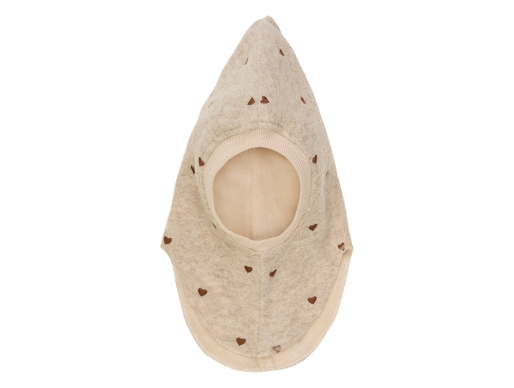Elefanthue i beige nuance (sand melange) fra Huttelihut med broderede hjerter. Huen er lavet i en blanding af 80% uld og 20% polyester med blødt foer i bomuldsblanding.