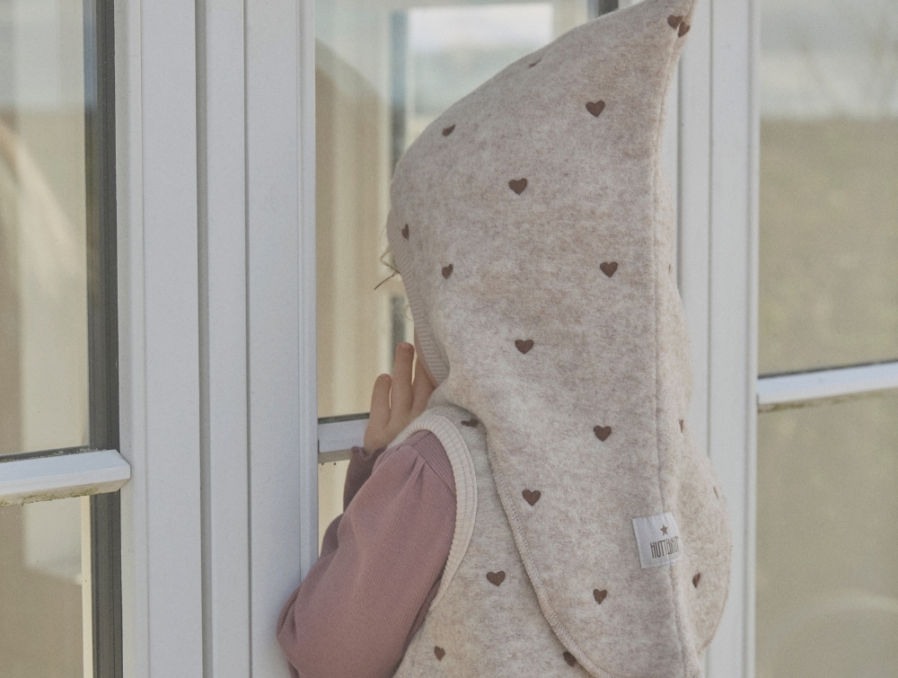 Elefanthuen har en spids form og dækker hoved, ører og hals. Den fine sandfarvede nuance kombineret med små hjertebroderier giver et sødt udtryk. Huen har et blødt bomuldsfoer, som føles behageligt mod barnets hud.