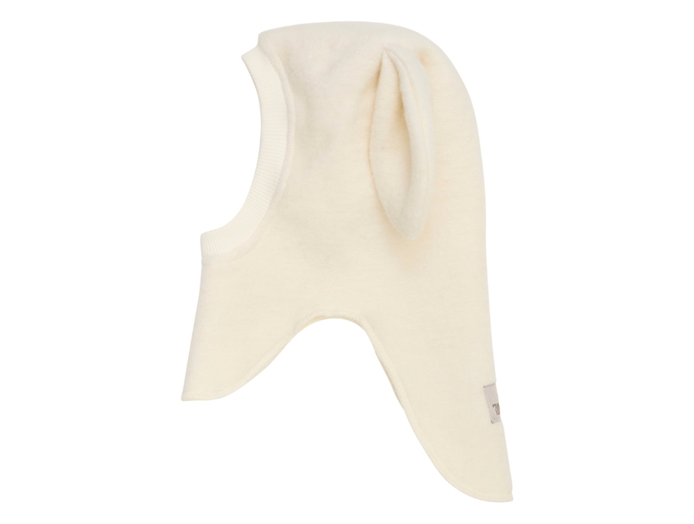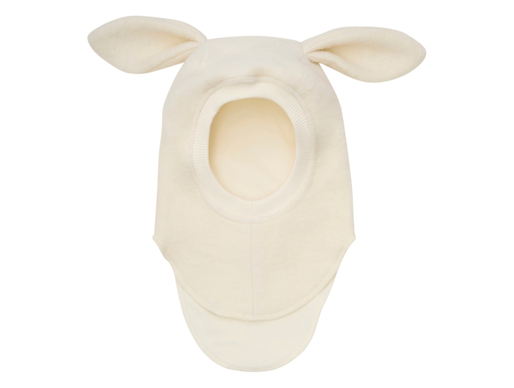 Elefanthue i lys råhvid nuance (tofu) fra Huttelihut med lange, bløde ører og blød ribkant ved ansigtet.