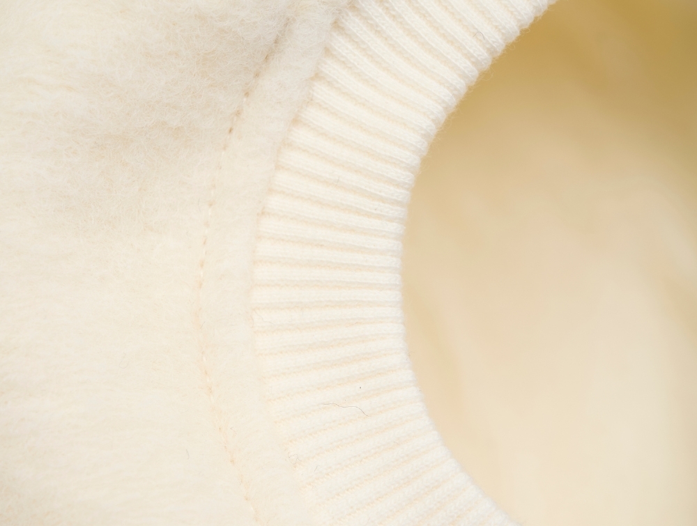 Elefanthuen er fremstillet i en varm uldblanding med blødt bomuldsfoer indvendigt, som giver en behagelig fornemmelse mod barnets hud. Den lette uld holder barnet varmt uden at føles tung og er velegnet til efterår og vinter.