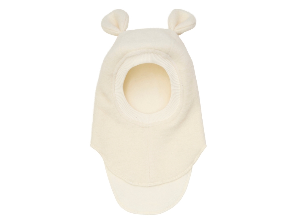 Elefanthue i råhvid nuance (tofu) fra Huttelihut med små, bløde ører og blød ribkant ved ansigtet.