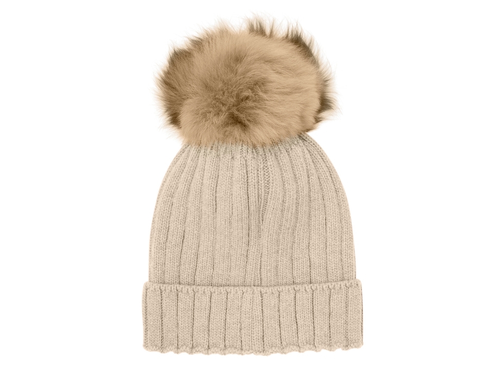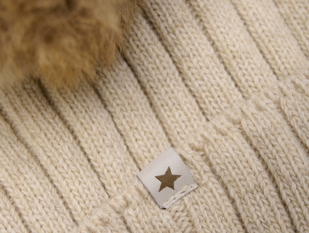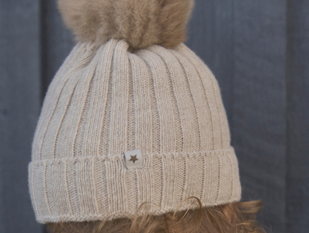 Huen er strikket i en blød uldkvalitet og har en stor pelskvast på toppen.