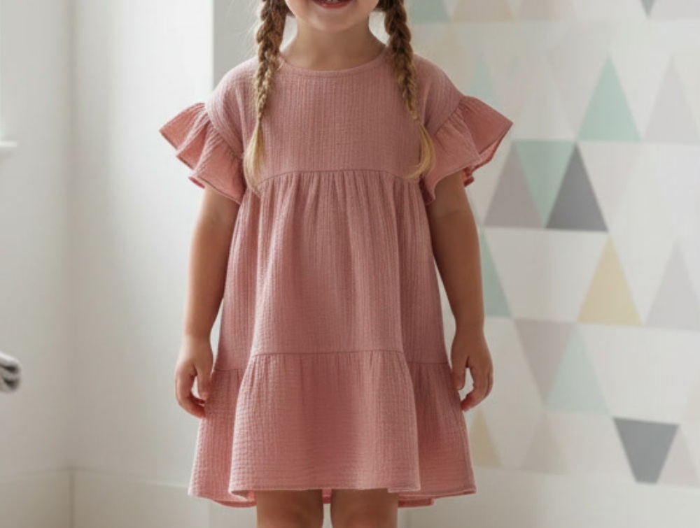 Huttelihut muslinkjole i rosa med flæseærmer