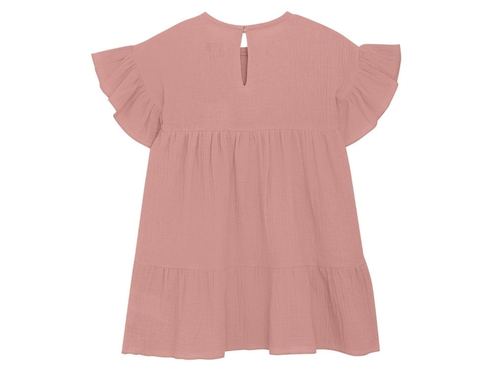 Kjole i vævet muslin fra Huttelihut i støvet rosa nuance (ash rose). Modellen har korte flæseærmer og skæring med rynker, der giver kjolen et feminint og luftigt udtryk. Lukkes med en lille knap i nakken.