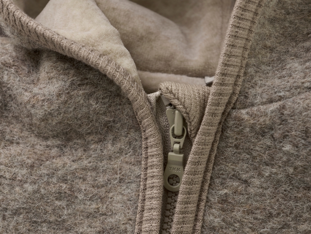 Huttelihut køredragt i camel melange med blød uld og hætte set forfraHuttelihut køredragt i camel melange med blød uld og hætte set tæt på lynlåsHuttelihut køredragt i camel melange med blød uld og hætte set bagfra