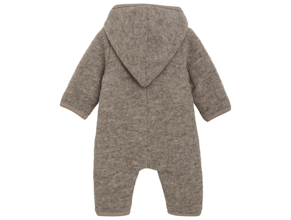 Huttelihut køredragt i brun melange med blød uld og hætte