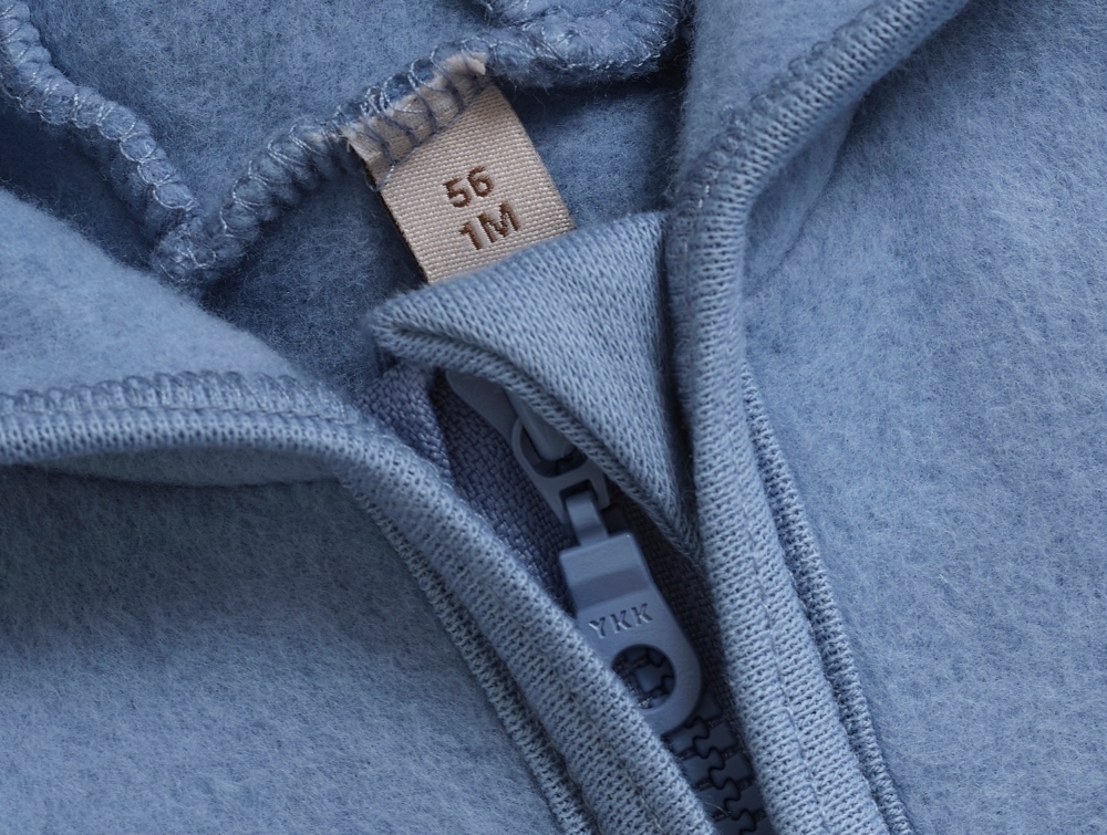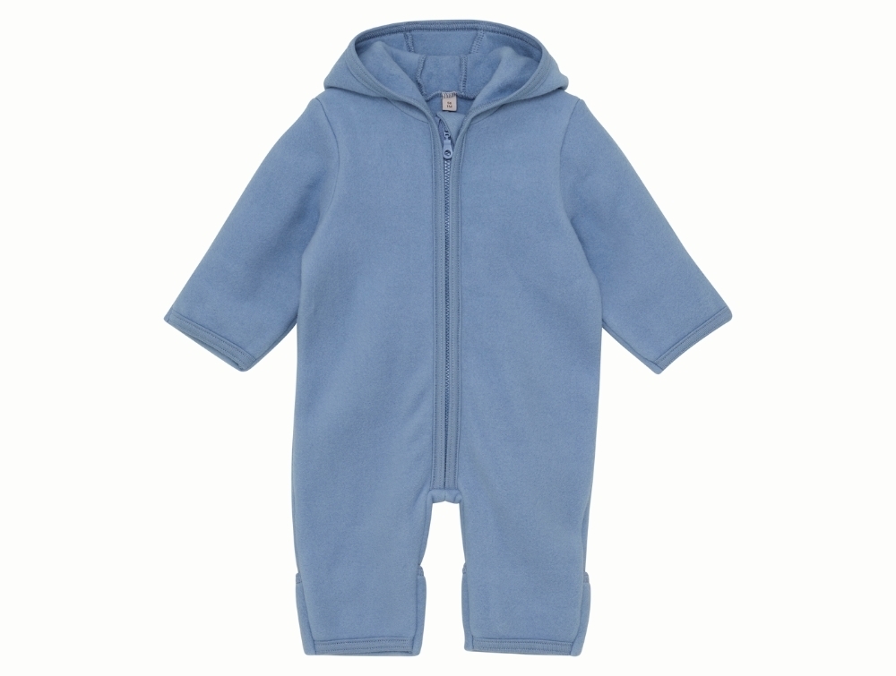 Dragten er lavet i 100% bomuldsfleece, som føles ekstra blød og behagelig mod huden. Den har hætte, lynlås foran med hagebeskytter samt ombuk ved hænder og fødder, så barnet holdes varmt. En ideel dragt til barnevognen eller de kølige dage i overgangssæsonen.