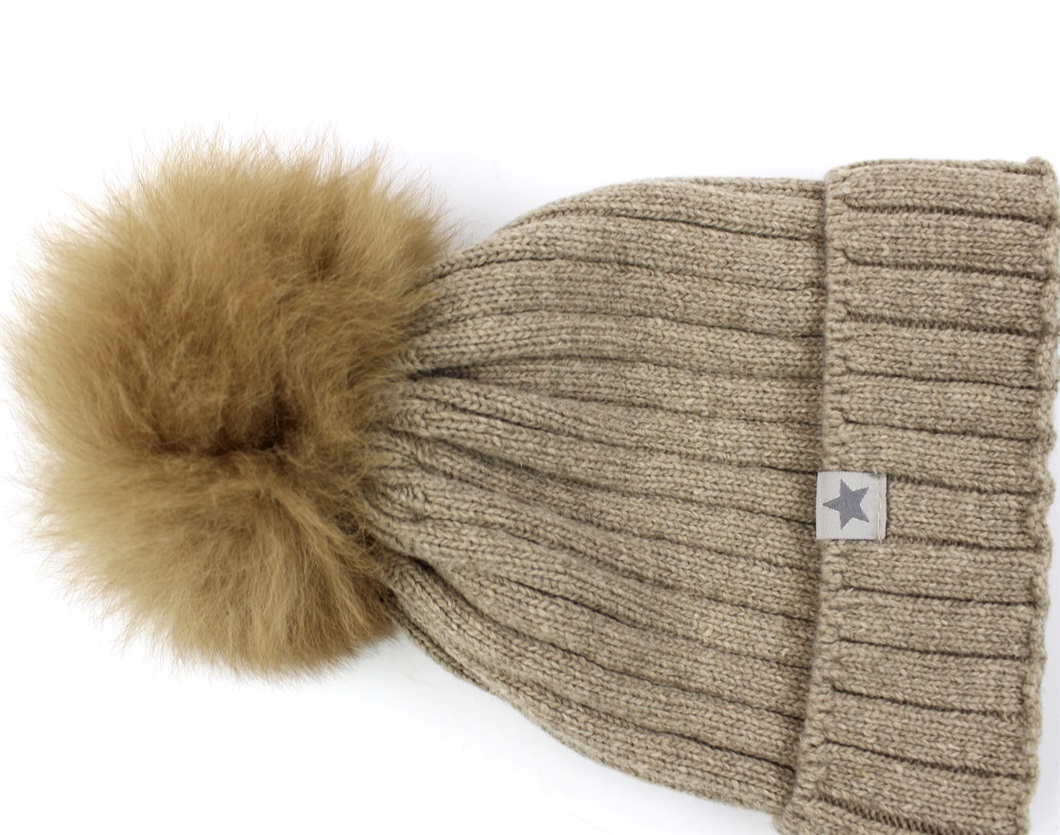 Hue i farven sand melange i bred ribstrik med kvast af alpaca fra Huttelihut.