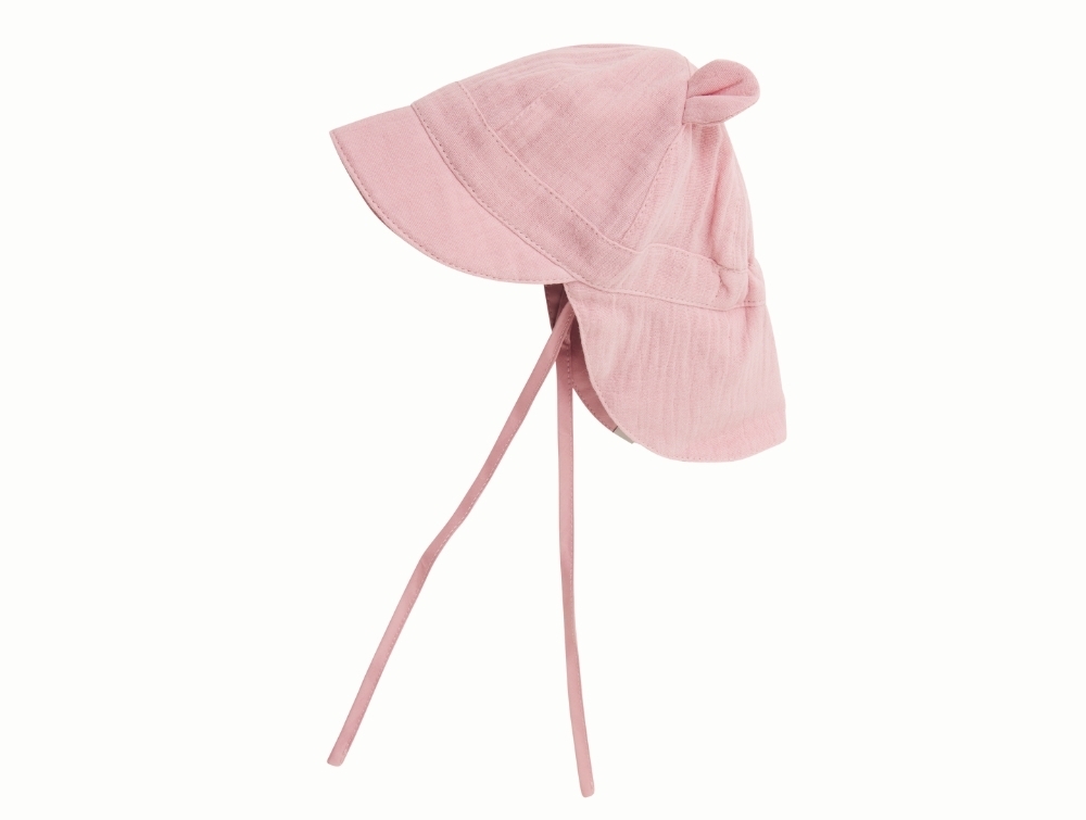Hatten er lavet i blød vævet muslin af 100% bomuld og har små bjørneører på toppen. Den har bindebånd i siderne for at sikre en god pasform samt skygge foran og ekstra længde bagtil, der beskytter nakken mod solen. En kær og funktionel solhat til de varme sommerdage.