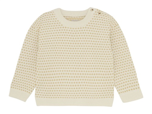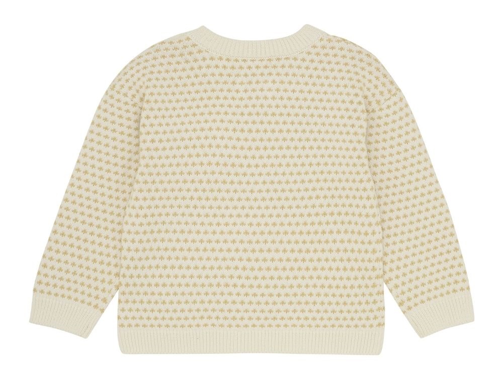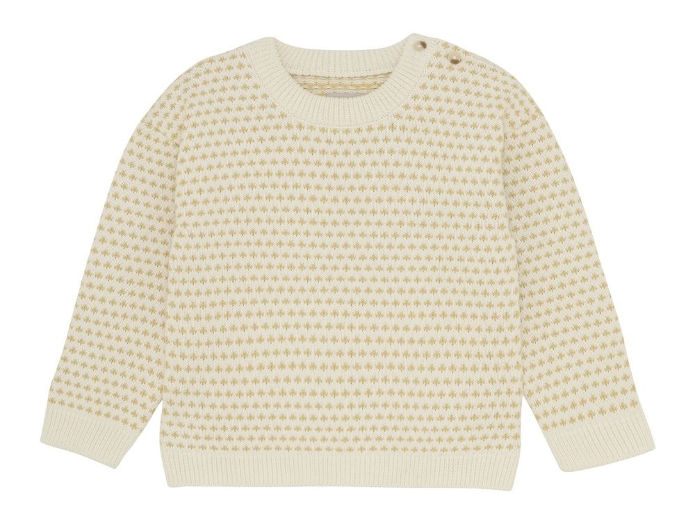 Striktrøje fra Huttelihut i en råhvid nuance med små sandfarvede mønstre over hele trøjen (moonstone). Trøjen har ribkanter og to knapper ved venstre skulder, så den er nem at tage af og på.