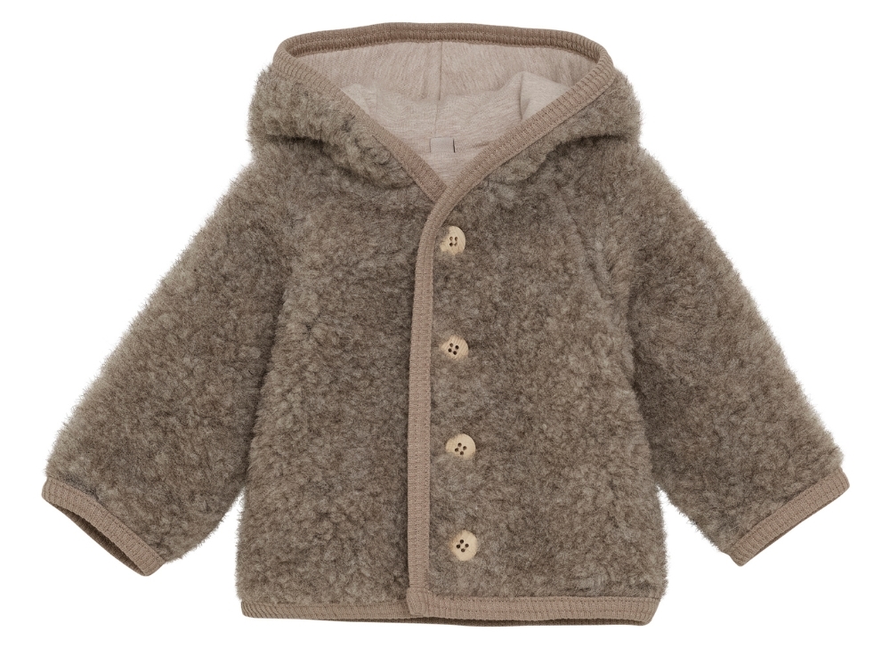 Uldjakke i brun nuance fra Huttelihut. Jakken har en blød, vamset overflade og spids hætte med kvast.