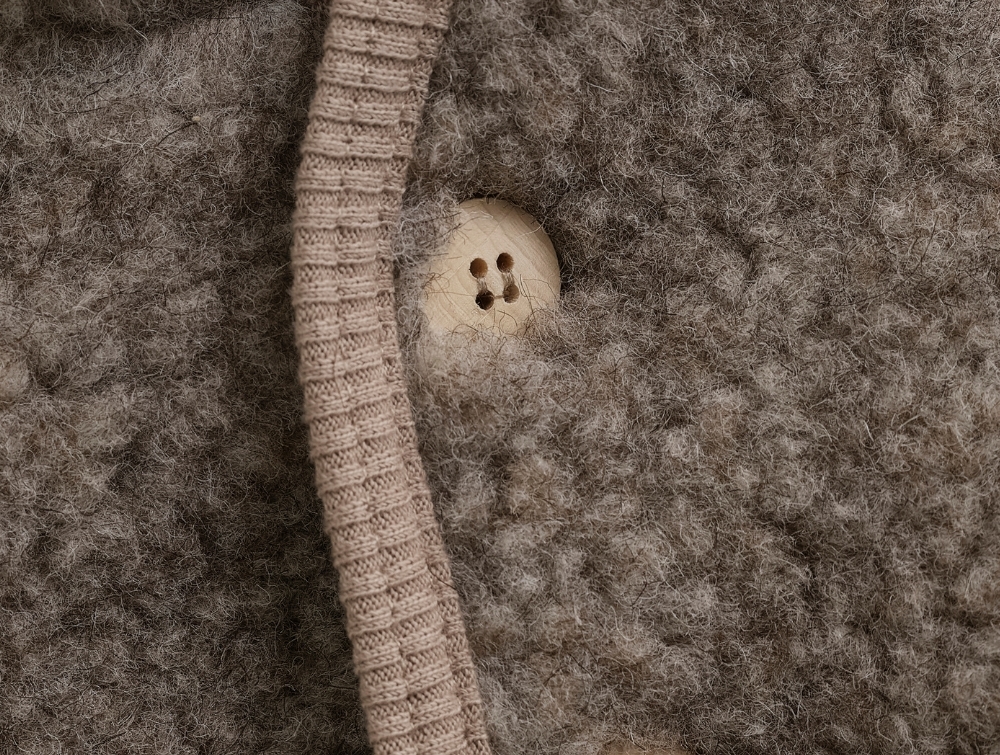 Huttelihut uldjakke camel melange med spids hætte og kvastHuttelihut uldjakke camel melange med hætte og kvast set bagfraHuttelihut uldjakke camel melange tæt på knaplukning