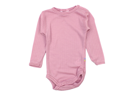 Rosa langærmet body i ren merinould fra Joha. Modellen er fremstillet i 100% merinould med et lodret ribmønster, som giver en let og behagelig pasform. Trykknapper på den ene skulder og mellem benene gør bodyen praktisk og nem at tage af og på.