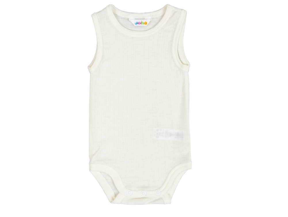 Body uden ærmer i råhvid nuance fra Joha. Modellen er fremstillet i 100% merinould og har et lodret ribmønster, som giver en let og behagelig pasform. Trykknapper mellem benene gør bodyen nem at tage af og på.
