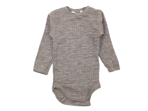 Beige langærmet body i ren merinould fra Joha. Modellen er fremstillet i 100% merinould med et lodret ribmønster, som giver en let og behagelig pasform. Trykknapper på den ene skulder og mellem benene gør bodyen praktisk og nem at tage af og på.