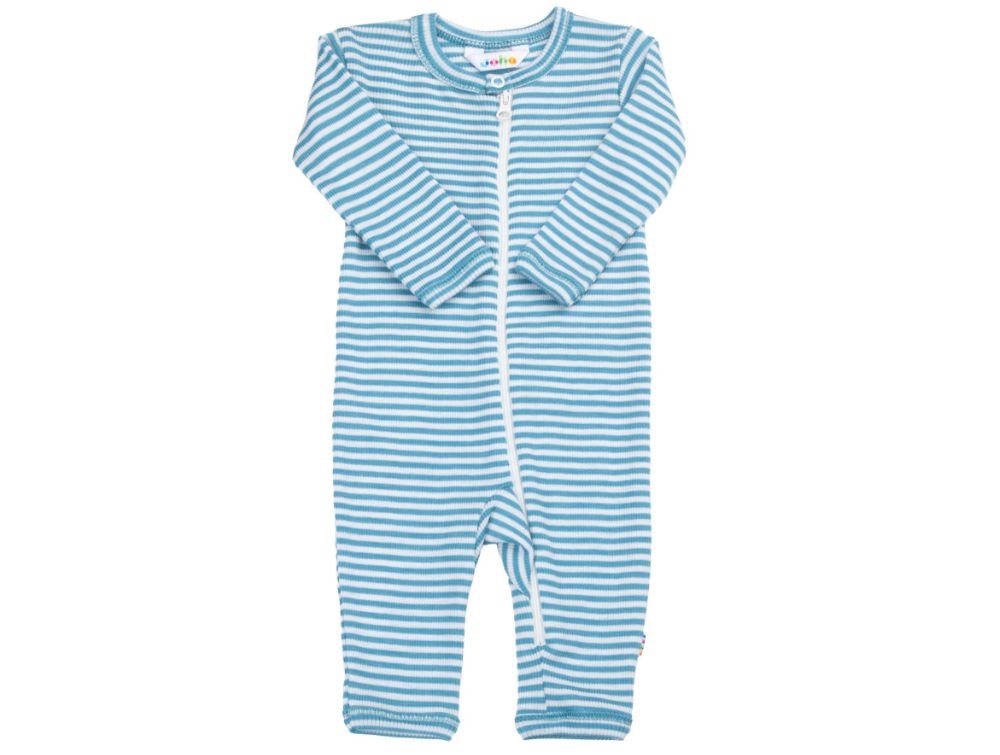 Blød og behagelig ulddragt i en fin ribstrikket kvalitet med klassiske striber i blå og hvid. Heldragten lukkes med lynlås og en trykknap i halsåbningen, og der er et blødt underfald under lynlåsen for ekstra komfort mod huden.