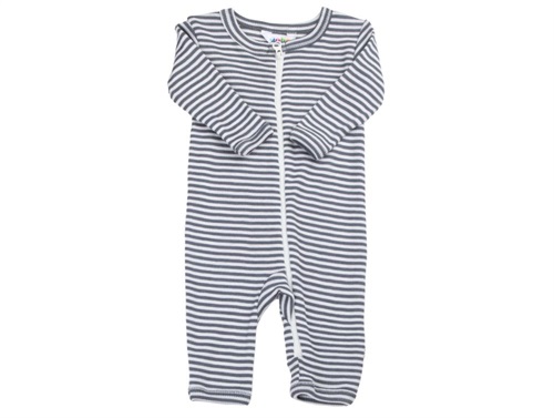 Blød og behagelig ulddragt i en fin ribstrikket kvalitet med klassiske striber i mørkegrå og hvid. Heldragten lukkes med lynlås og en trykknap i halsåbningen, og der er et blødt underfald under lynlåsen for ekstra komfort mod huden.
