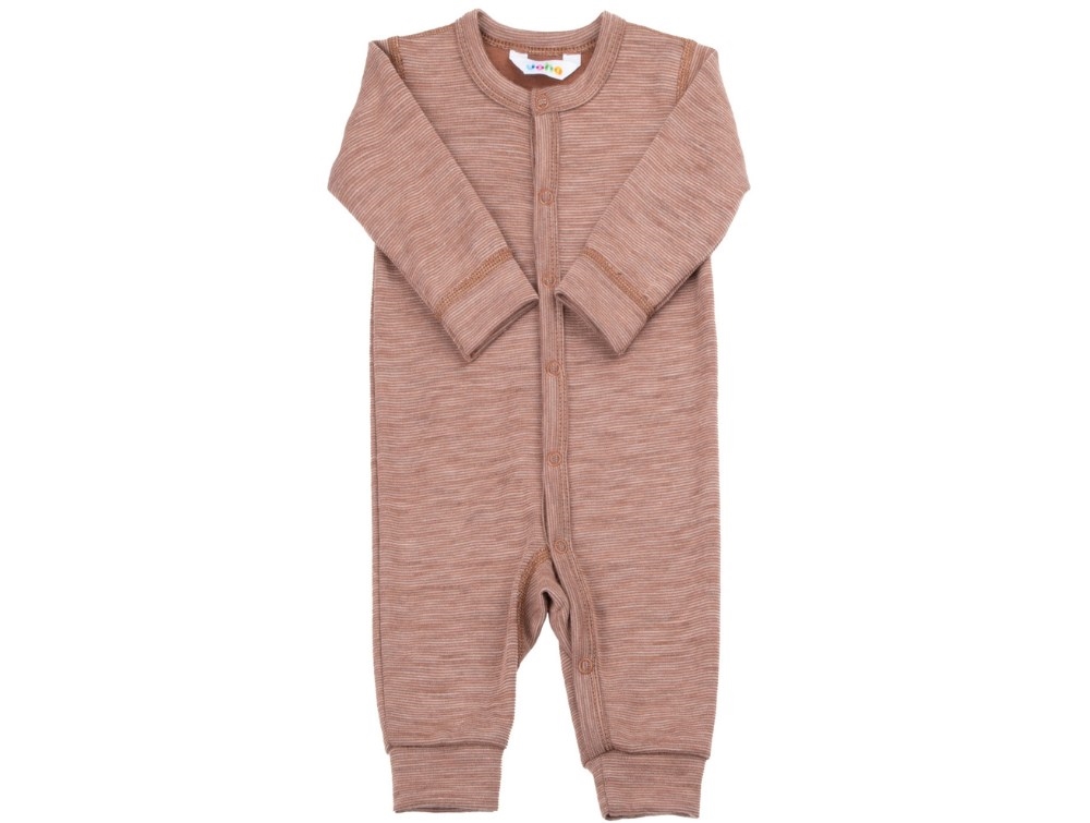Uldens naturlige egenskaber gør dragten temperaturregulerende og åndbar, så barnet holdes varmt i koldt vejr og køligt på varmere dage. De fine smalle striber giver et enkelt og klassisk udtryk.