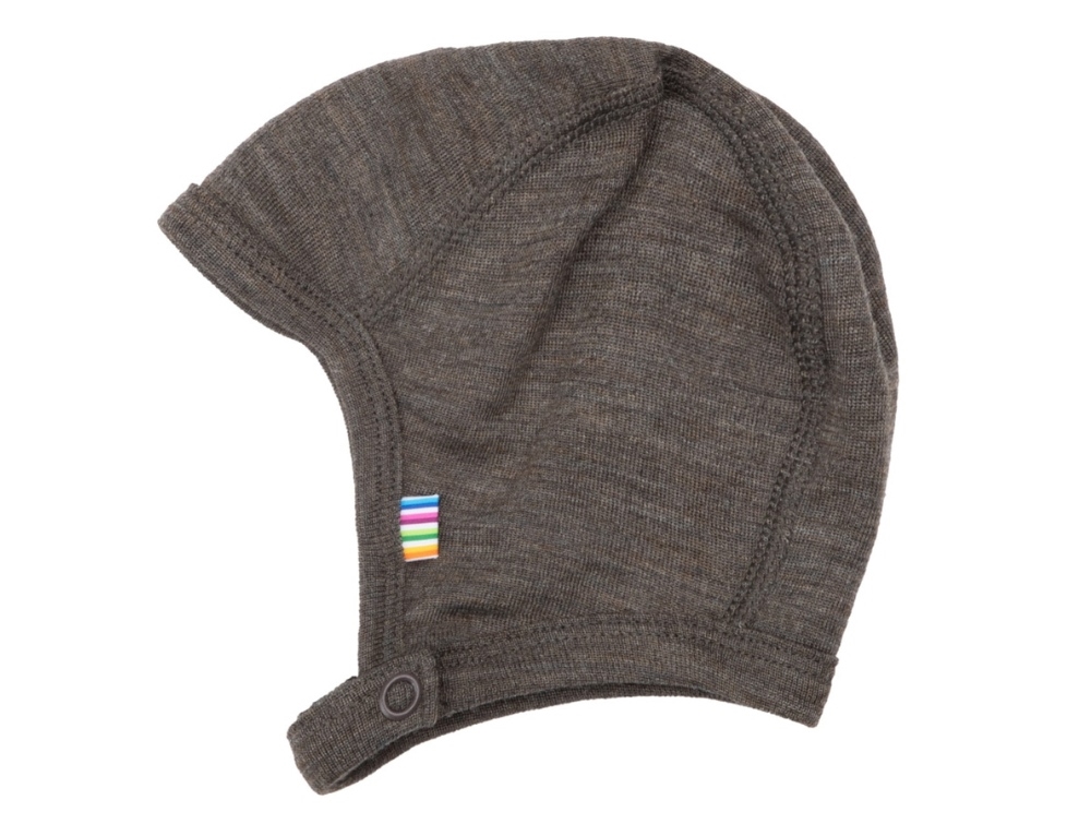 Johas hjelme i uld/silke er super fine til nyfødte og små babyer, som skal have varme om hovedet. Denne model i brun melange er meget blød, let og sidder godt på hovedet uden at genere. Trykknappen under hagen sikrer, at den bliver på plads.