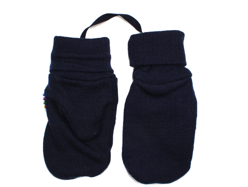 Marinefarvede vanter fra Joha i blød merinould. Vanterne er forbundet med en praktisk snor, så de ikke bliver væk, når barnet har dem på.