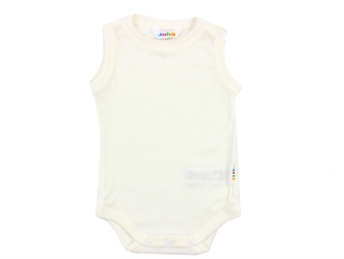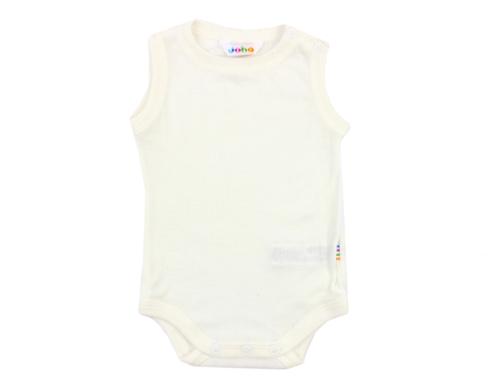 Råhvid body uden ærmer i en blød blanding af merinould og silke fra Joha. Modellen er fremstillet i 85% merinould og 15% silke, hvilket giver en let, blød og elastisk kvalitet. Trykknapper på begge skuldre og mellem benene gør den nem at tage af og på.