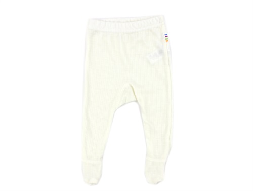 Leggings i natur nuance med fødder fra Joha. Designet i 100% merinould, som er certificeret med OEKO-TEX®. Den bløde ribstruktur gør bukserne fleksible og behagelige for baby.