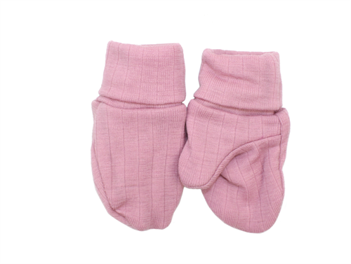 Vanter i old rose nuance fra Joha i blød merinould. Modellen har tommelfinger og er forbundet med en hvid snor, så de ikke bliver væk, når barnet har dem på.