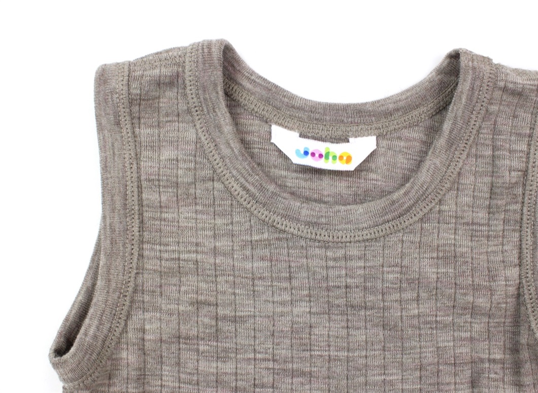 Undertrøje i sesame melange fra Joha i et klassisk unisex design. Modellen har brede skulderstropper og rund hals og er fremstillet i en let merinould med diskret lodret rillemønster.
