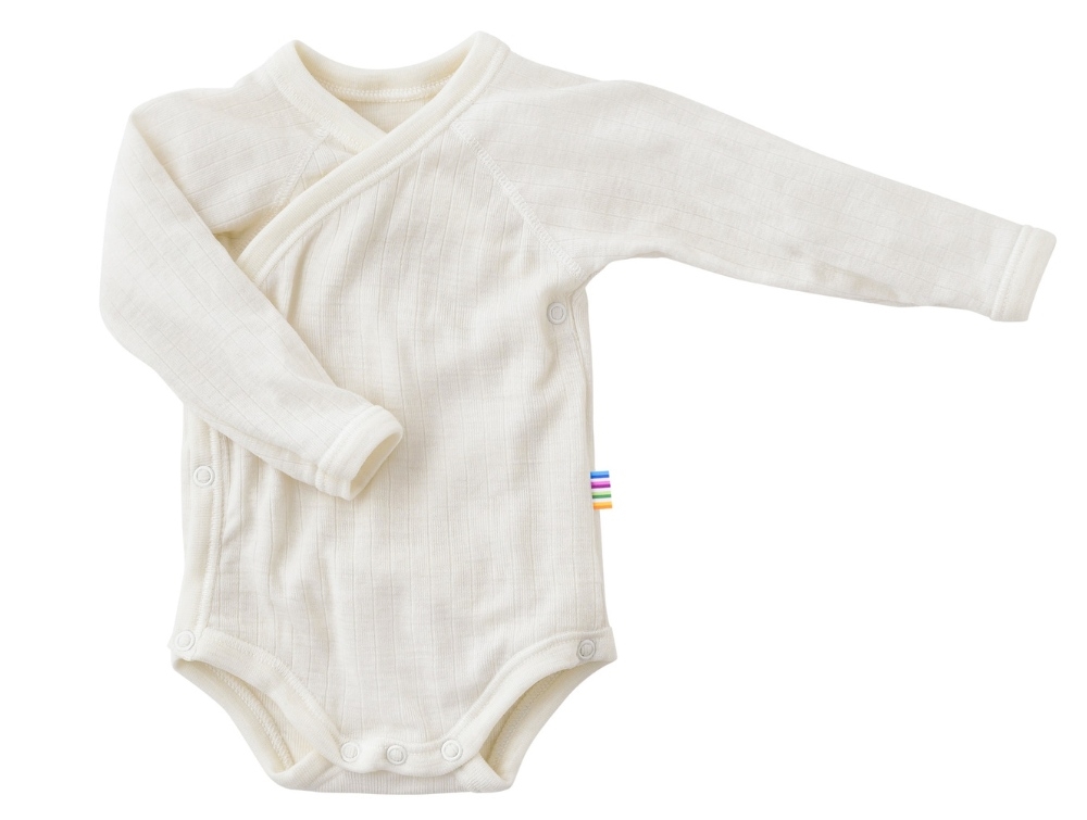 Wrap body i naturfarve fra Joha med lange ærmer og praktiske trykknapper i siden og mellem benene. Den fulde åbning gør den særlig nem at tage af og på, hvilket er en fordel til de mindste.