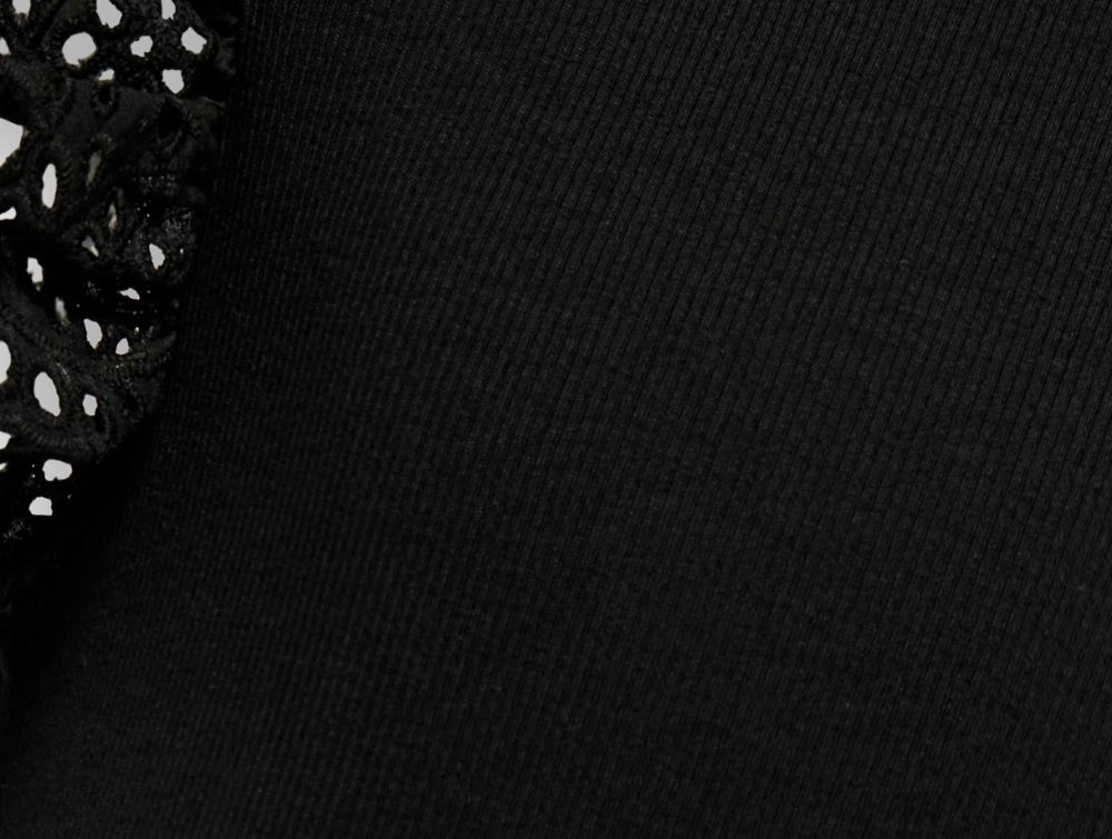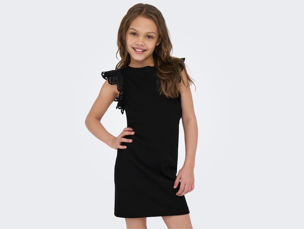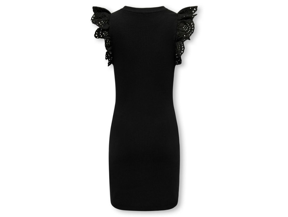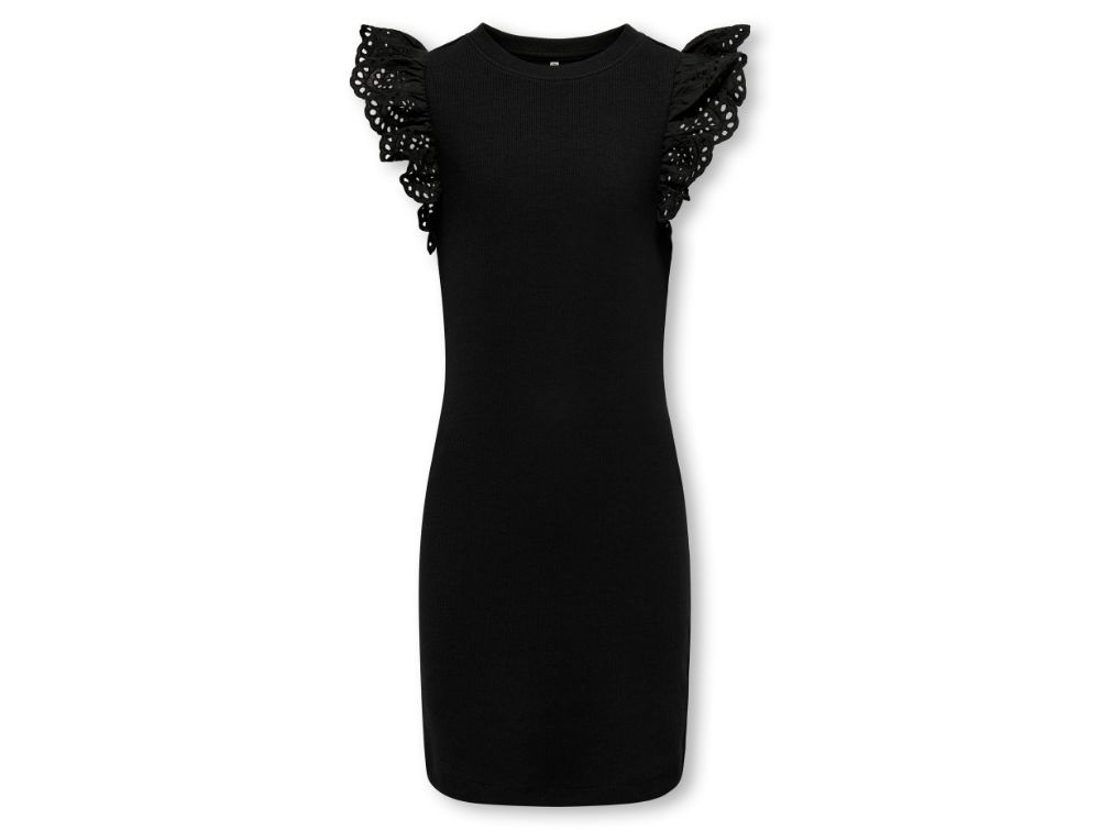 Kjole i sort fra KIDS ONLY med korte flæseærmer i broderie anglaise og ribstruktur.