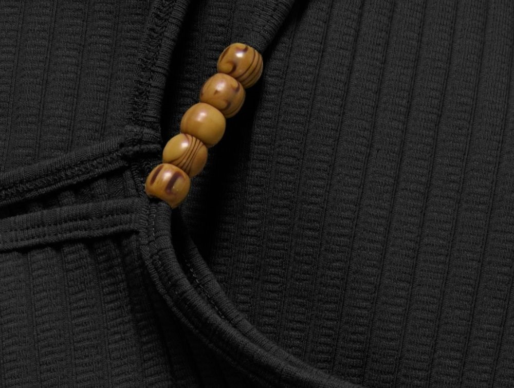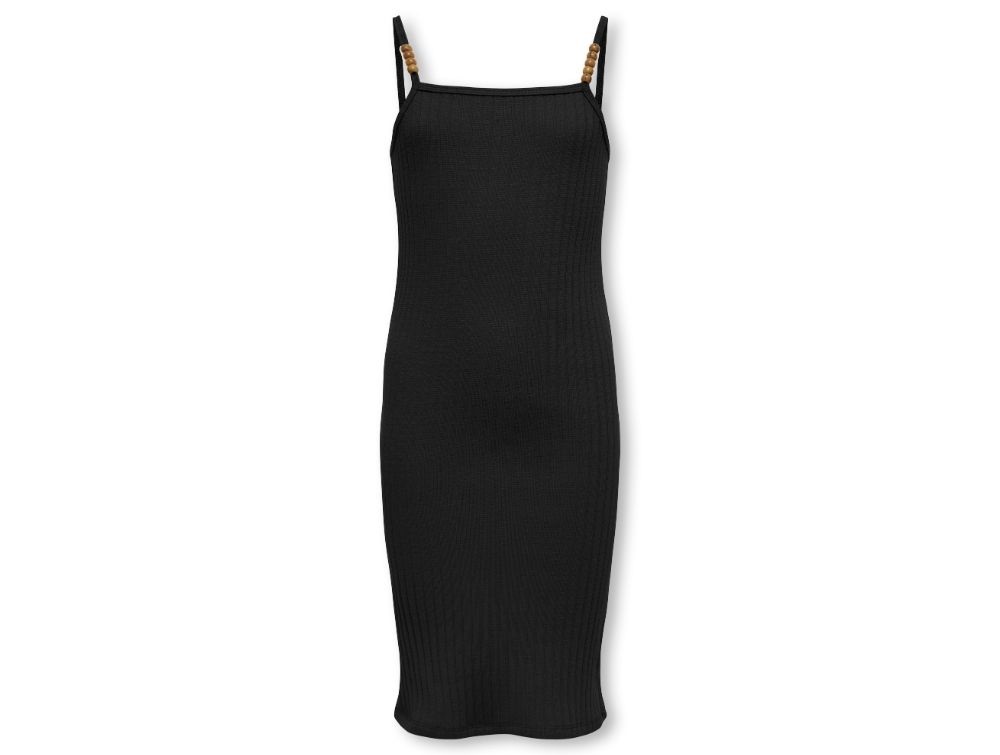 kids only kjole i sort med perledetaljer på stropper, set forfrakids only tætsiddende kjole i sort, set bagfranaerbillede af sorte stropper med træperler på kids only kjolepige iført sort kjole fra kids only med perledetaljer på stropper