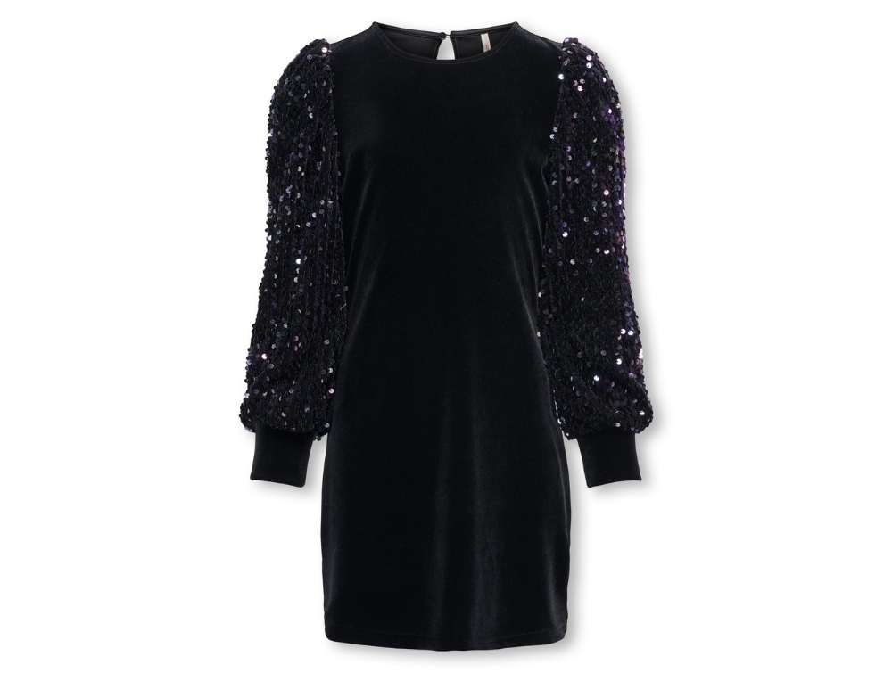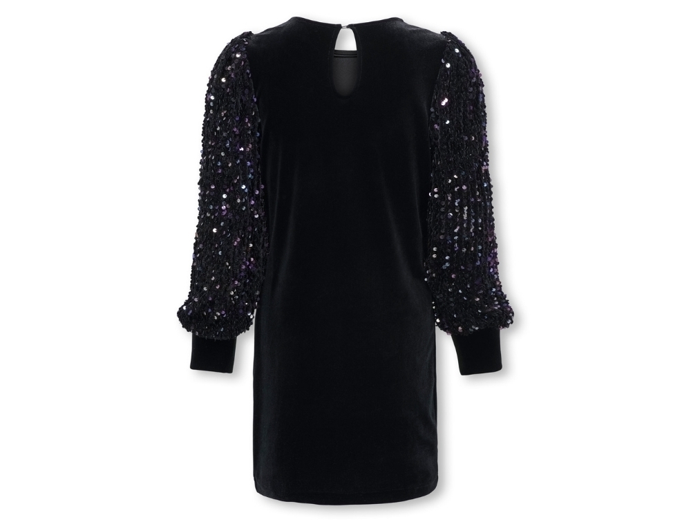 Kjole i sort velour fra kids ONLY med pailletbesatte ærmer, der giver et festligt udtryk.