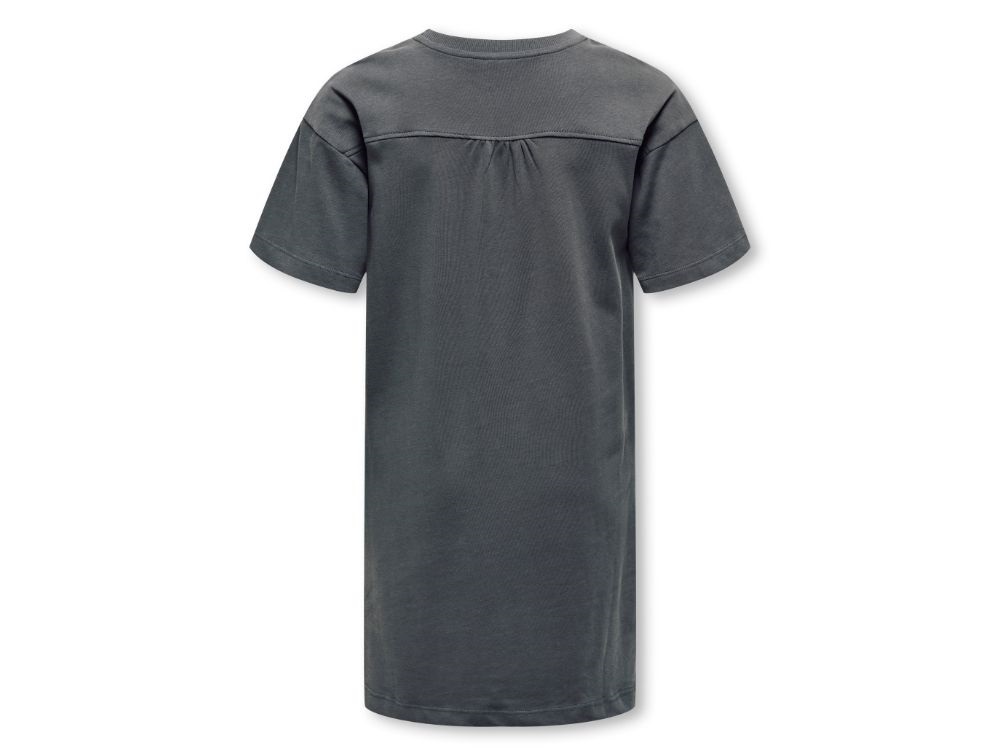 sortgrå t-shirtkjole fra kids only med løs pasform og rund hals, set forfrabagside af sortgrå kjole fra kids only med rynkeeffekt og længere ryg
