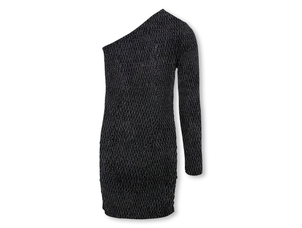 Modellen har et moderne snit med én skulder, ribstruktur og metallisk glimmertråd, som giver en elegant og festlig effekt. Stoffet er elastisk og former sig flot efter kroppen.