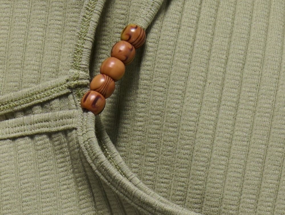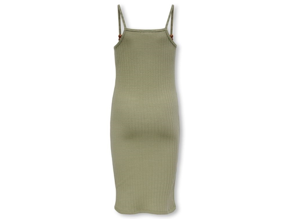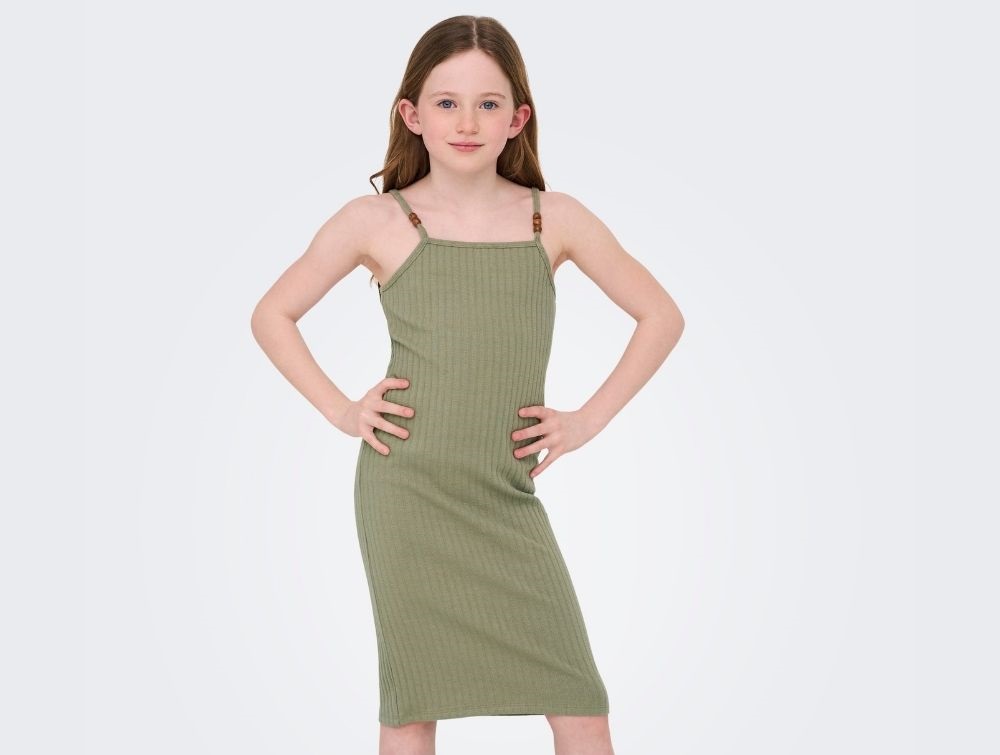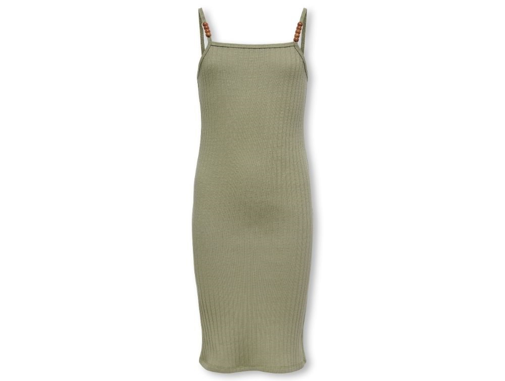 kids only kjole i grøn med perledetaljer på stropper, set forfrakids only tætsiddende kjole i grøn, set bagfrapige iført grøn kjole fra kids only med perledetaljer og stroppernaerbillede af grøn ribstruktur og træperler på kids only kjole
