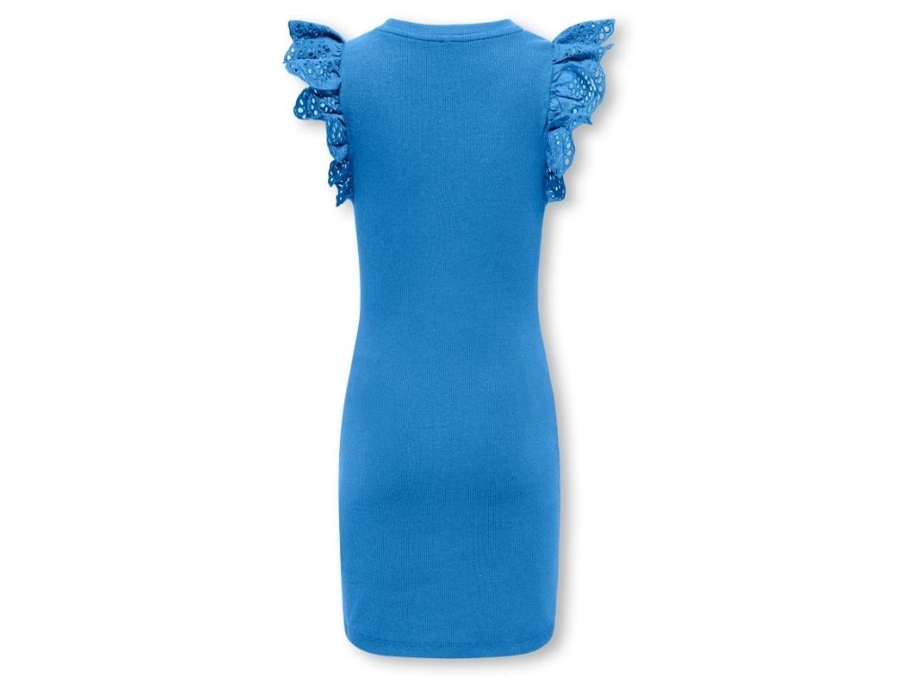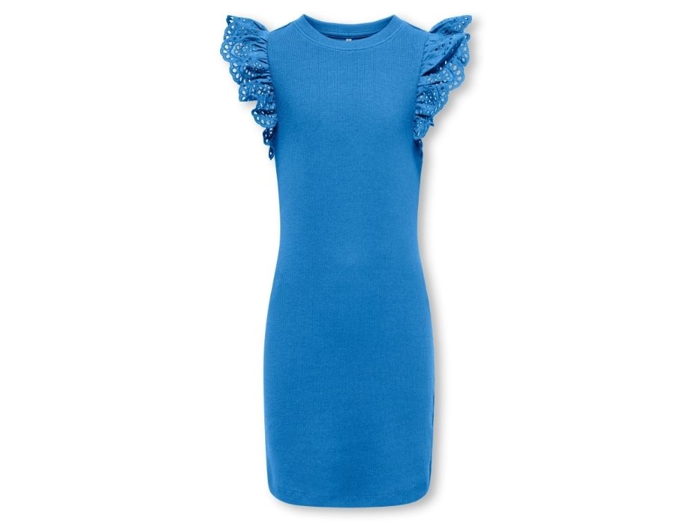 Kjole i blå fra KIDS ONLY med korte flæseærmer i broderie anglaise og ribstruktur.