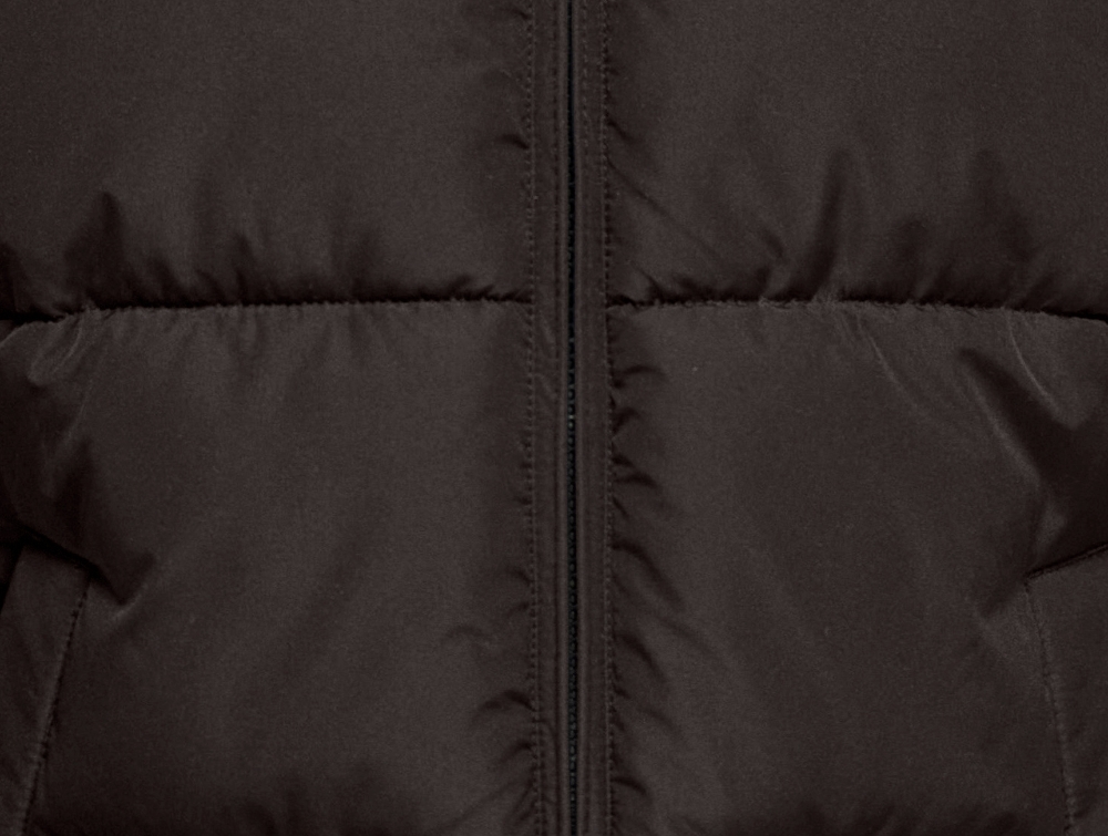 Jakken er fremstillet i genanvendt polyester, som giver en blød og slidstærk overflade. Den lette polstring sikrer varme uden at føles tung, og det enkle design gør den nem at style. Da jakken kan maskinvaskes, er den samtidig praktisk i brug.