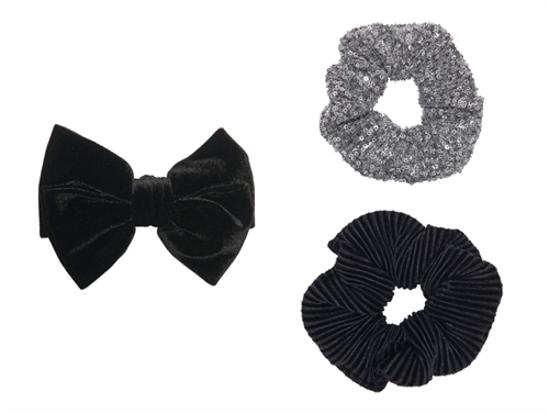 2 scrunchie hårelastikker i farverne sort velour og sølv glitter samt én hårklemme med sort veloursløjfe fra Kids ONLY.