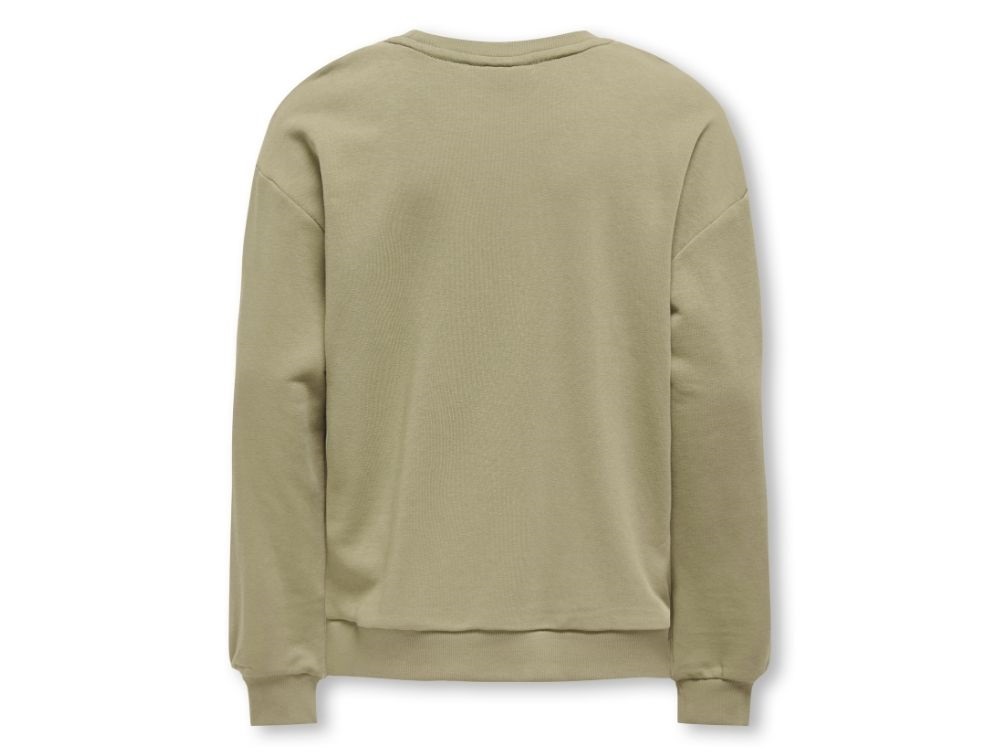 Sweatshirt i støvet grøn fra Kids ONLY med lyserødt tekstprint på brystet og klassiske ribkanter.