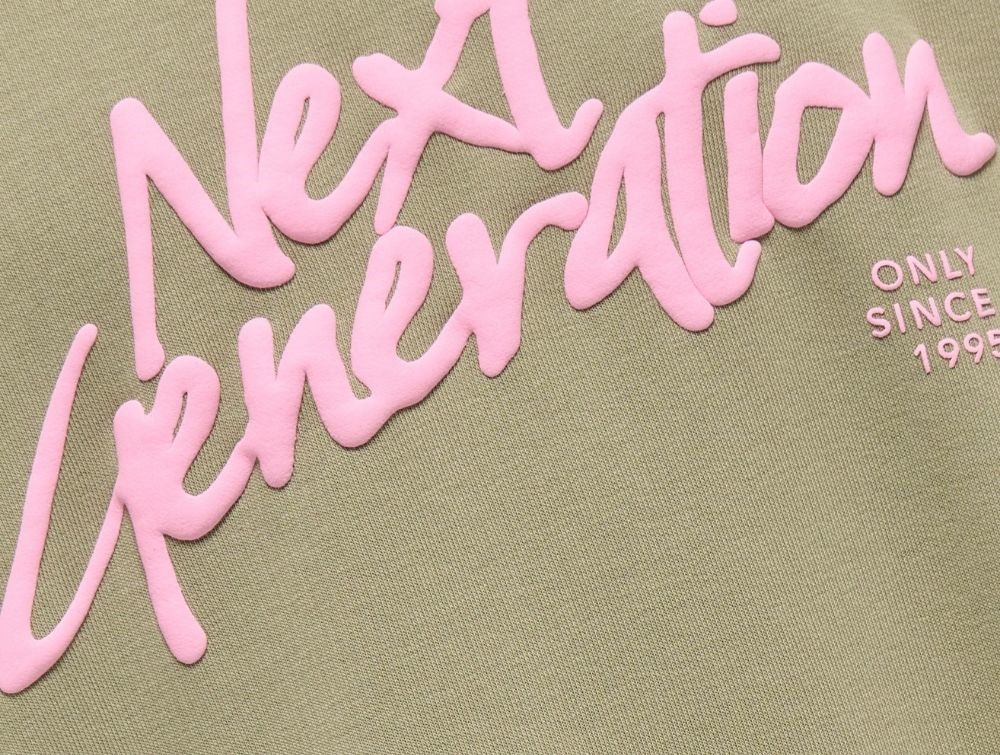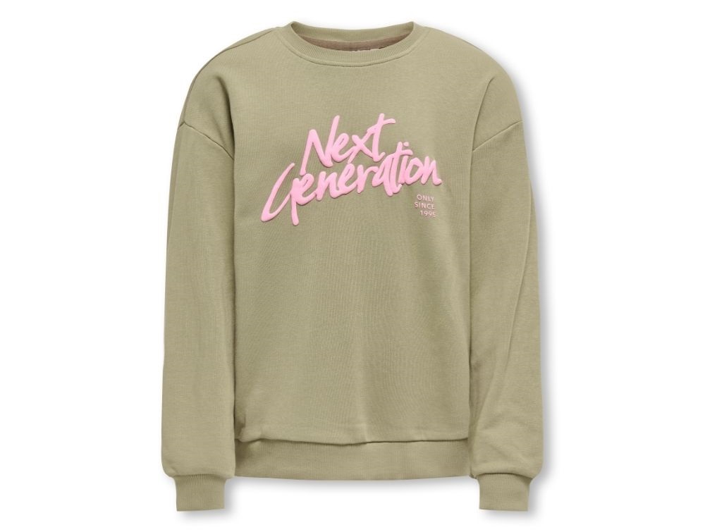 sweatshirt i støvet grøn fra kids only med lyserødt tekstprint next generation, set forfrabagside af støvet grøn sweatshirt fra kids only med dropped shoulders og ribkanternærbillede af lyserødt gummiprint med teksten next generation på grøn sweatshirt fra kids only