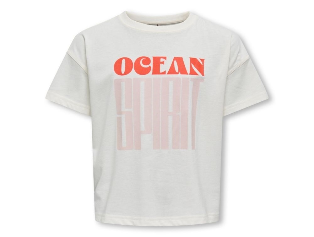 T-shirt i hvid (cloud dancer) fra KIDS ONLY med stort "Ocean Spirit"-print i rød og rosa på brystet.
