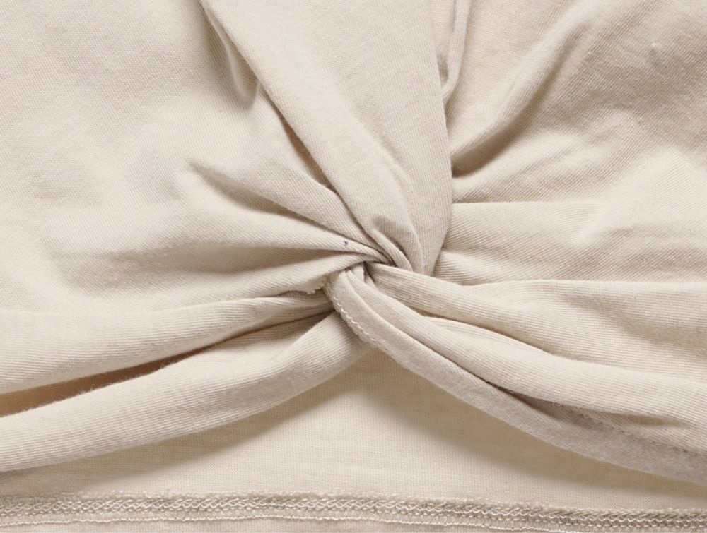 pige iført beige t-shirt fra kids only med twistdetalje og løstsiddende pasformt-shirt i beige fra kids only med twistdetalje foran og rund halsbagside af beige t-shirt fra kids only med almindelig pasformnærbillede af knudedetalje på beige t-shirt fra kids only