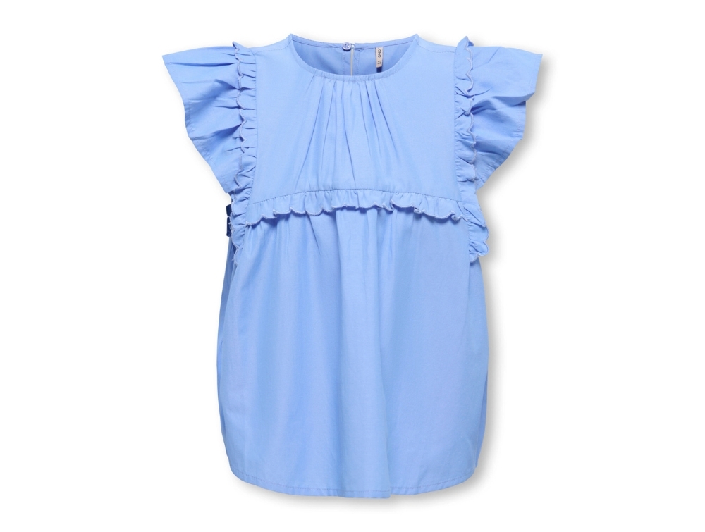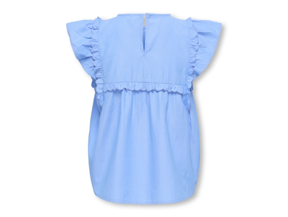 Top i blå nuance (cornflower blue) fra Kids ONLY med flæser ved skuldrene og korte ærmer.