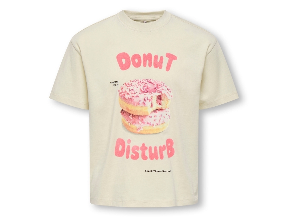 T-shirt i råhvid nuance (birch) fra KIDS ONLY med sjovt print af lyserøde donuts og teksten “Donut Disturb”.